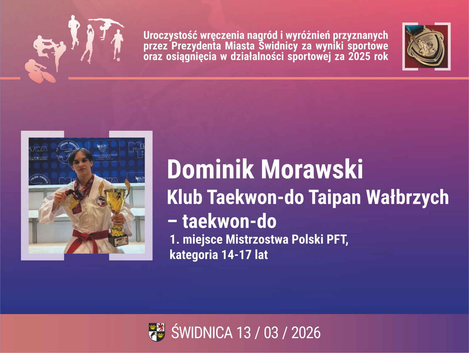 11. Dominik Morawski – Klub Taekwon-do Taipan Wałbrzych – taekwon-do. 1. miejsce Mistrzostwa Polski PFT, kategoria 14-17 lat