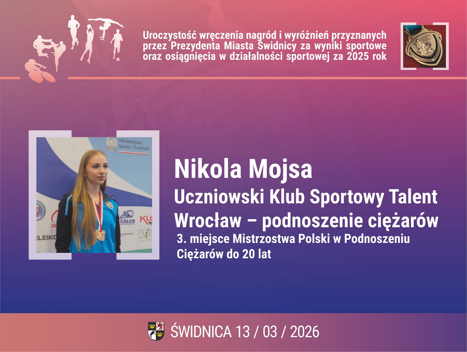 15. Nikola Mojsa – Uczniowski Klub Sportowy Talent Wrocław – podnoszenie ciężarów. 3. miejsce Mistrzostwa Polski w Podnoszeniu Ciężarów do 20 lat