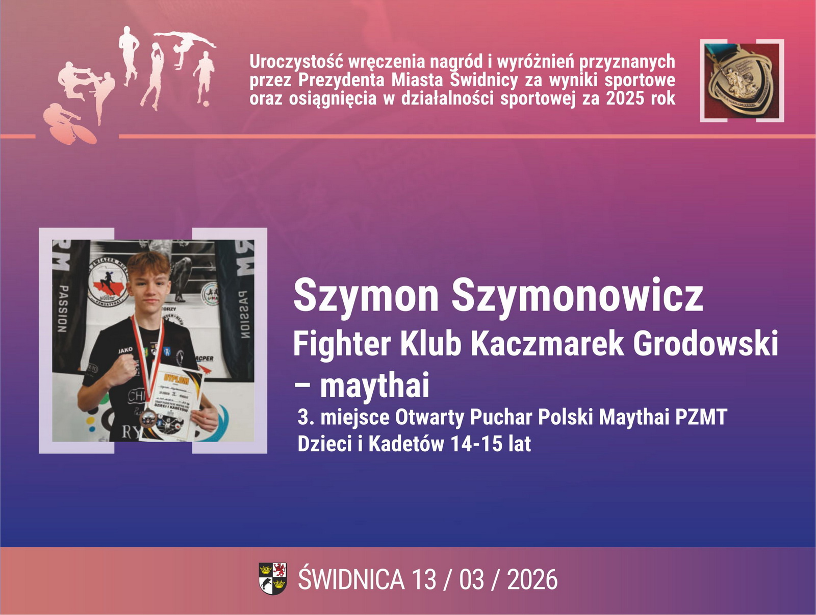 16. Szymon Szymonowicz – Fighter Klub Kaczmarek Grodowski – maythai. 3. miejsce Otwarty Puchar Polski Maythai PZMT Dzieci i Kadetów 14-15 lat