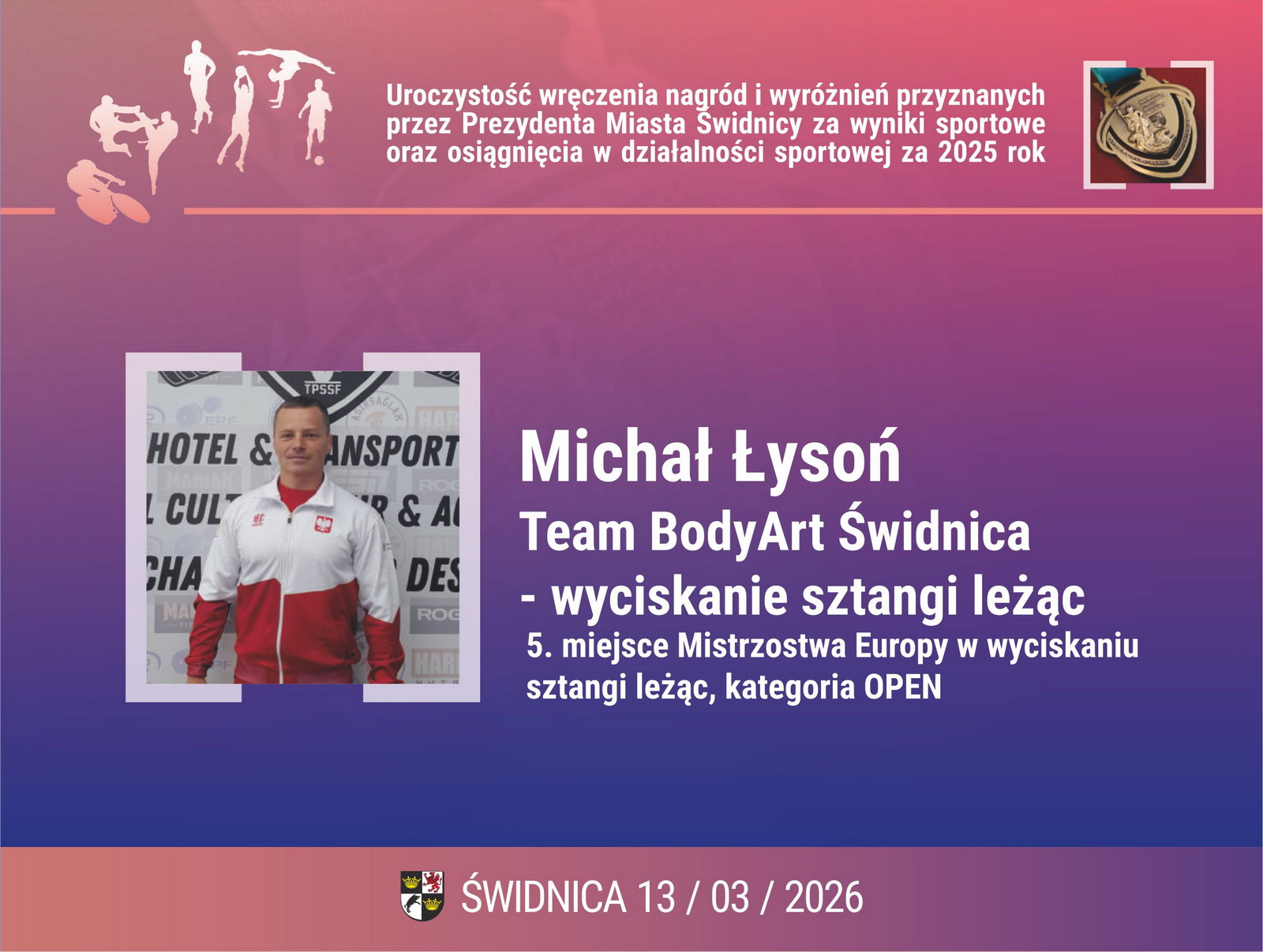 1. Michał Łysoń – Team BodyArt Świdnica – wyciskanie sztangi leżąc. 5. miejsce Mistrzostwa Europy w wyciskaniu sztangi leżąc, kategoria OPEN,