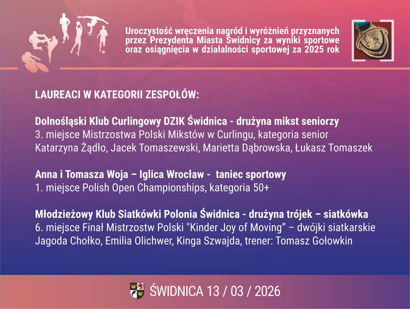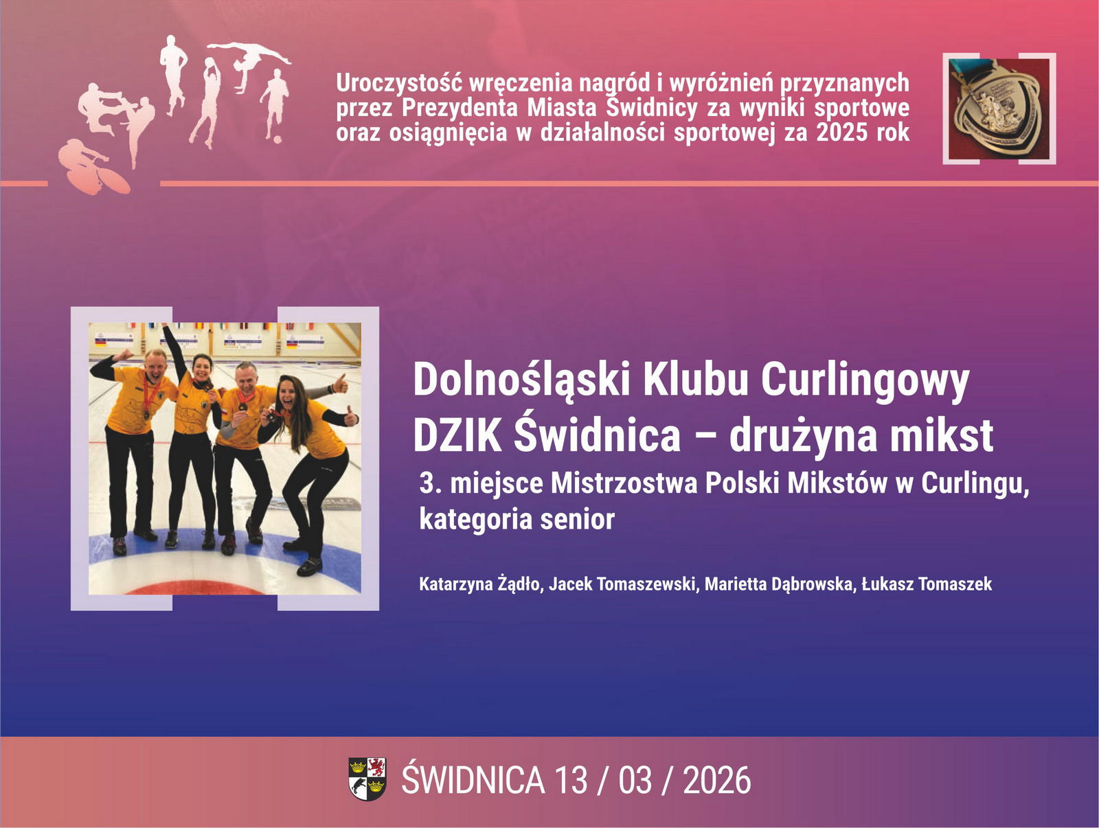 1. Dolnośląski Klub Curlingowy DZIK Świdnica – drużyna mikst seniorzy. 3. miejsce Mistrzostwa Polski Mikstów w Curlingu, kategoria senior: Katarzyna Żądło, Jacek Tomaszewski, Marietta Dąbrowska, Łukasz Tomaszek