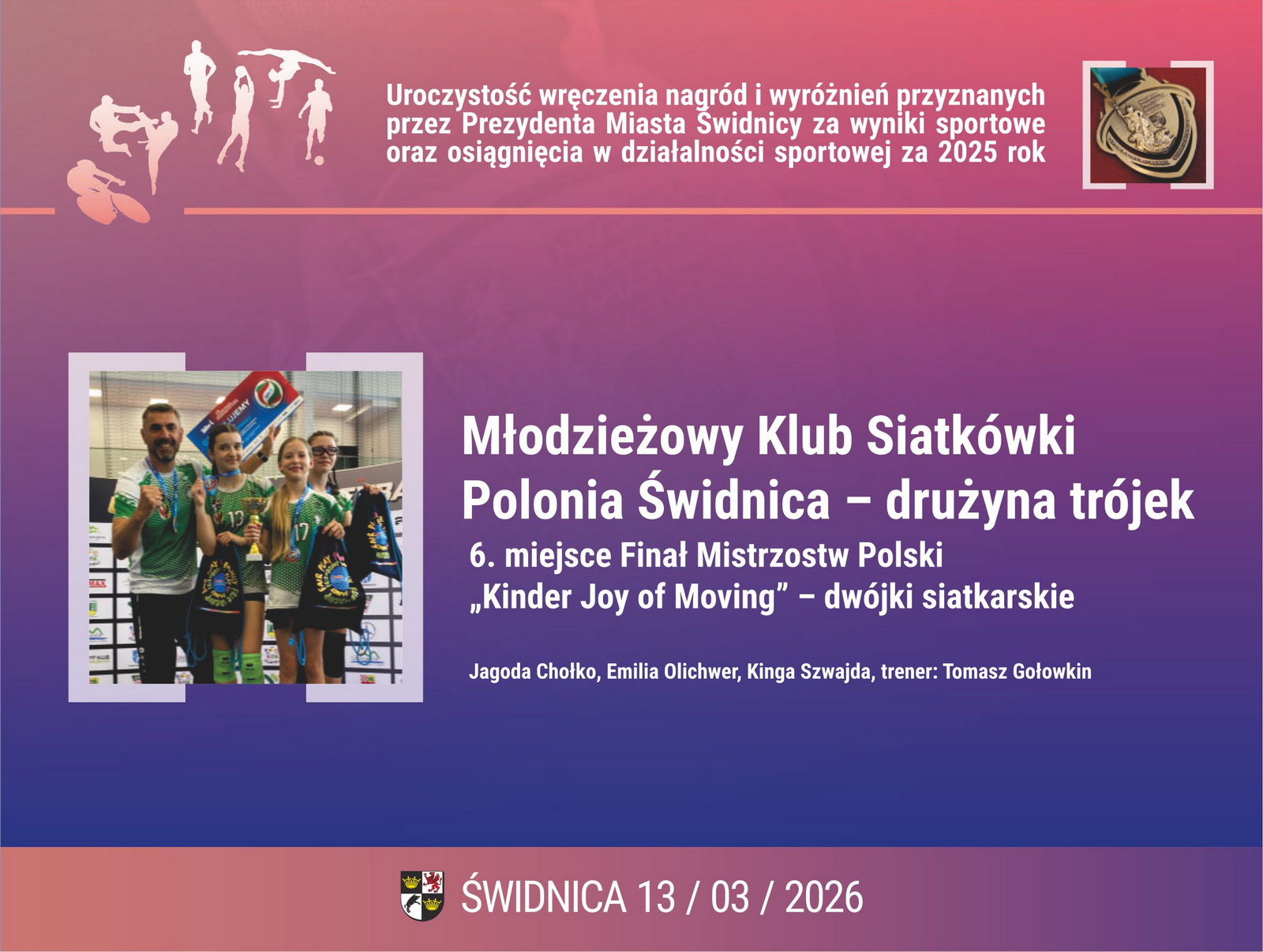 3. Młodzieżowy Klub Siatkówki Polonia Świdnica – drużyna trójek – siatkówka. 6. miejsce Finał Mistrzostw Polski „Kinder Joy of Moving” – dwójki siatkarskie: Jagoda Chołko, Emilia Olichwer, Kinga Szwajda, trener: Tomasz Gołowkin