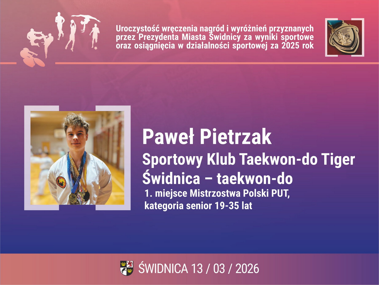 2. Paweł Pietrzak – Sportowy Klub Taekwon-do Tiger Świdnica – taekwon-do. 1. miejsce Mistrzostwa Polski PUT, kategoria senior 19-35 lat,