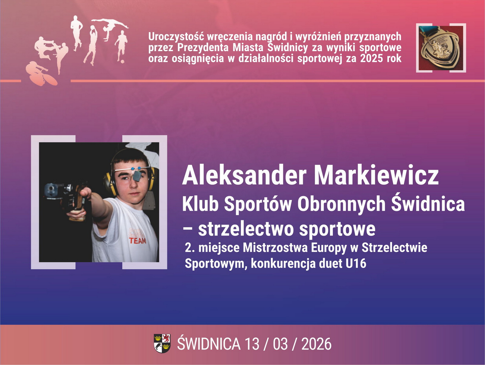 6. Aleksander Markiewicz – Klub Sportów Obronnych Świdnica – strzelectwo sportowe. 2. miejsce Mistrzostwa Europy w Strzelectwie Sportowym, konkurencja duet U16